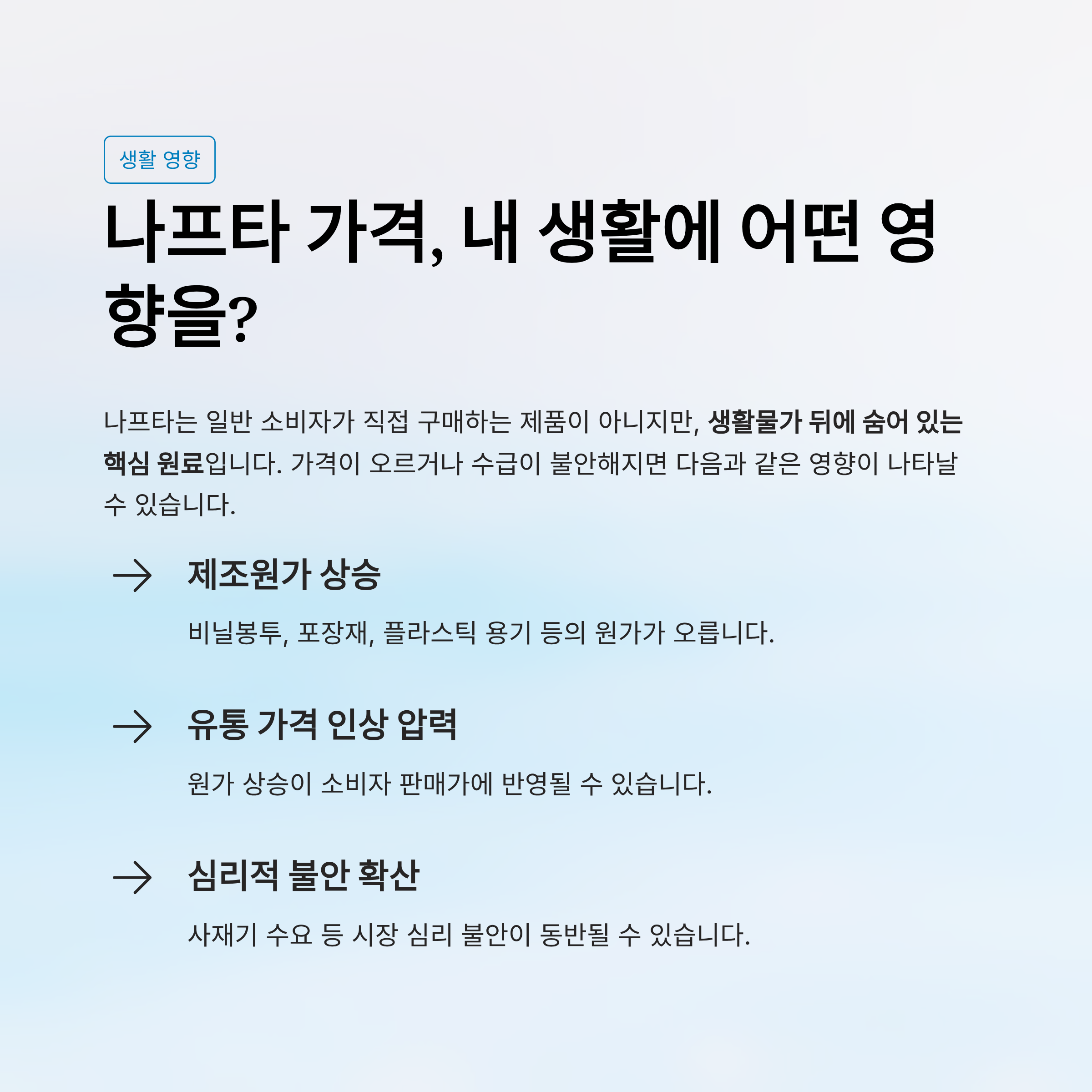 나프타 가격이 오르거나 수급이 불안하면 생활 속에서는 다음과 같은 영향이 나타날 수 있습니다.
