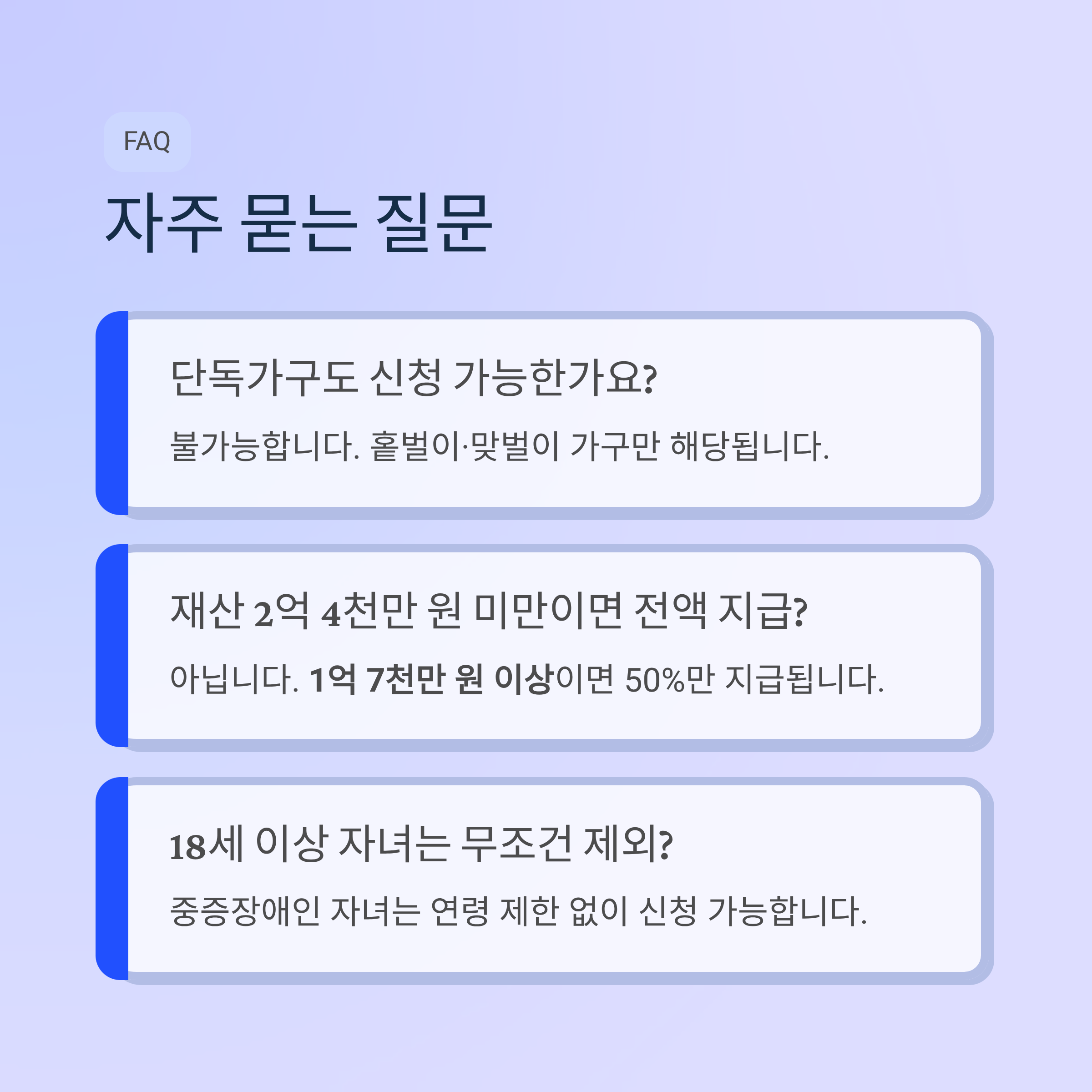 즉, 자녀 1명이라면 50만~100만 원, 2명이면 100만~200만 원, 3명이면 150만~300만 원 범위에서 산정될 수 있습니다. 다만 실제 지급액은 단순 자녀 수만으로 정해지는 것이 아니라 가구 유형, 소득, 재산을 함께 심사해 확정됩니다.