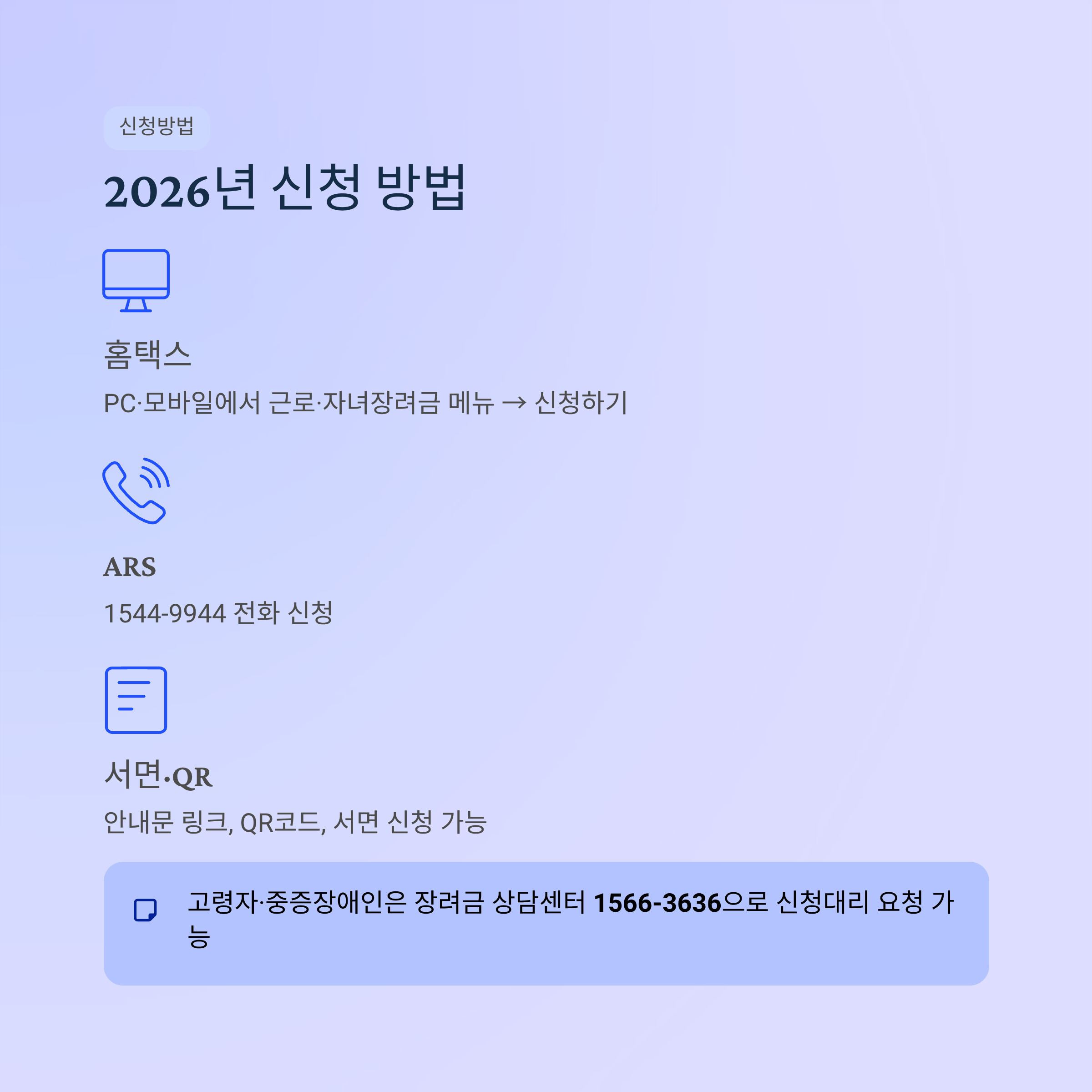 신청 방법은 여러 가지가 있지만 가장 많이 쓰는 방식은 홈택스와 ARS입니다. 국세청은 ARS 1544-9944, 홈택스 모바일·PC 신청, 신청안내문 링크, QR코드, 서면 신청 등을 안내하고 있습니다. 또한 고령자나 중증장애인이 직접 신청하기 어려운 경우에는 장려금 상담센터 1566-3636을 통해 신청대리 요청도 가능합니다.