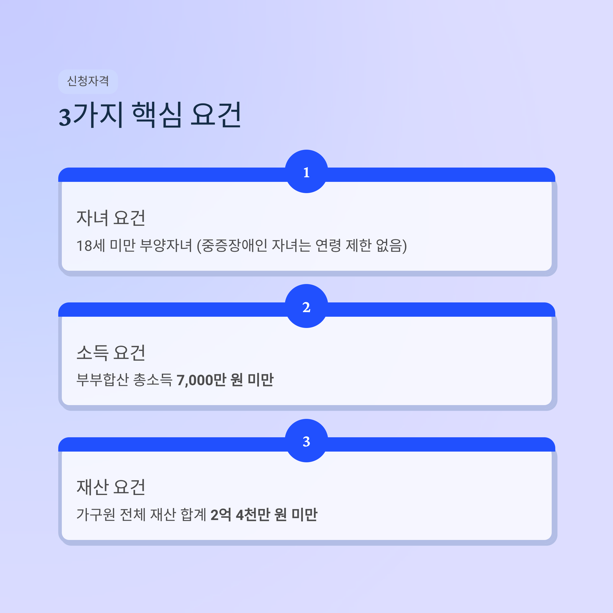 자녀장려금은 아래 3가지 핵심 요건을 모두 충족해야 합니다. 자녀 요건, 소득 요건, 재산 요건을 차례대로 확인하시면 됩니다.