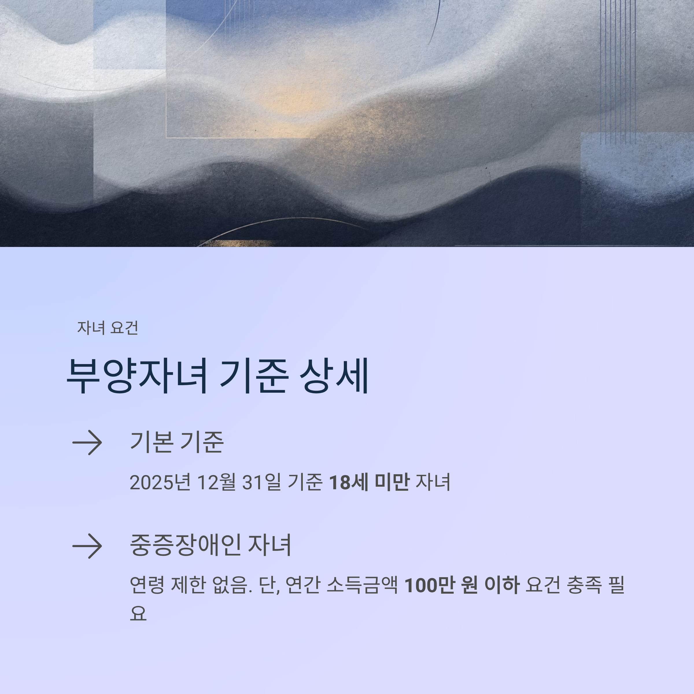 원칙적으로는 18세 미만 자녀가 대상입니다. 다만 중증장애인 자녀는 연령 제한을 받지 않으며, 이 경우에도 연간 소득금액 100만 원 이하 요건은 확인해야 합니다.