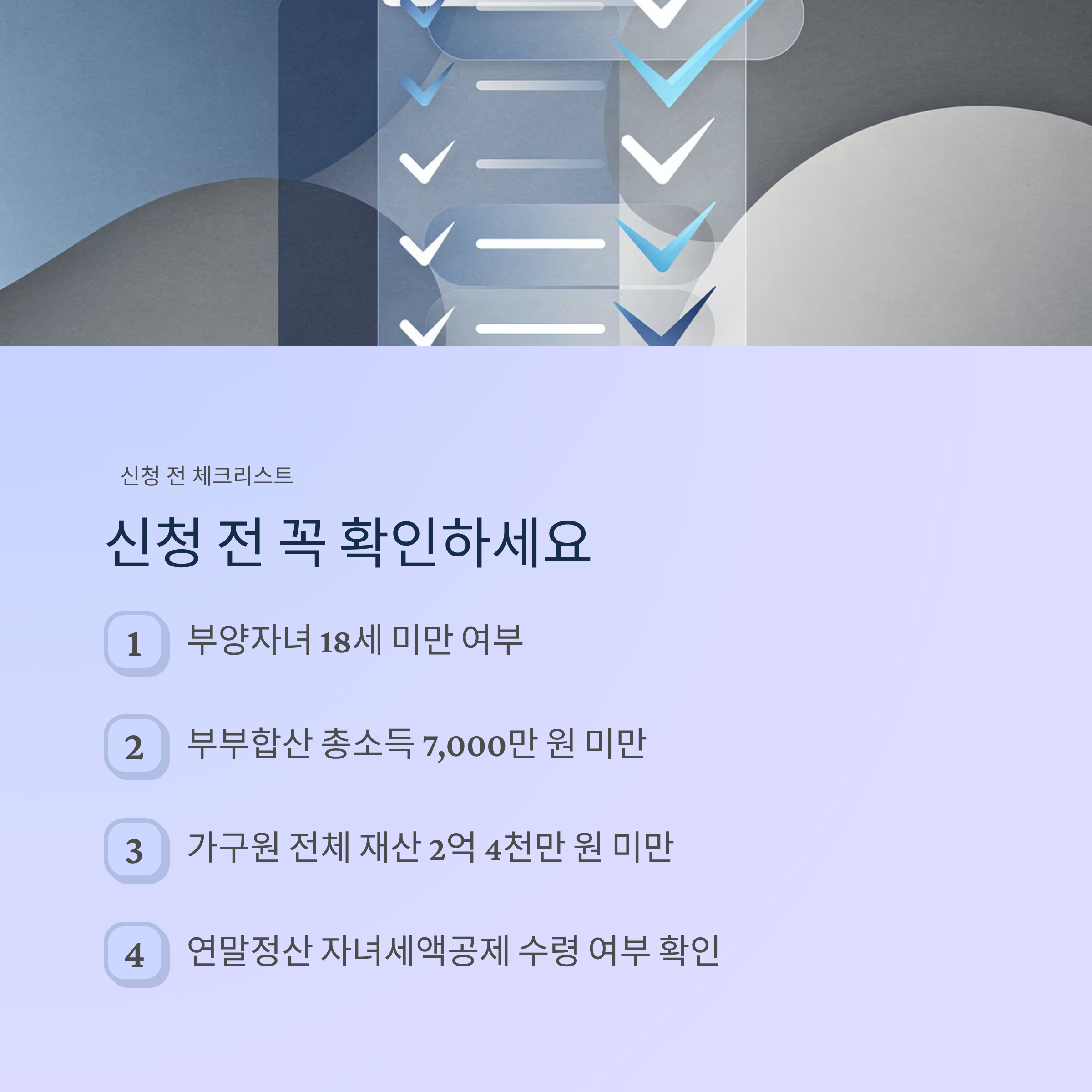 자녀장려금 신청 전에 아래 4가지는 꼭 점검해보셔야 합니다. 첫째, 부양자녀가 18세 미만인지 확인합니다. 둘째, 중증장애인 자녀라면 연령 제한은 없지만 소득금액 100만 원 이하인지 봐야 합니다. 셋째, 부부합산 총소득이 7,000만 원 미만인지 확인합니다. 넷째, 가구원 전체 재산이 2억 4천만 원 미만인지 살펴봐야 합니다.