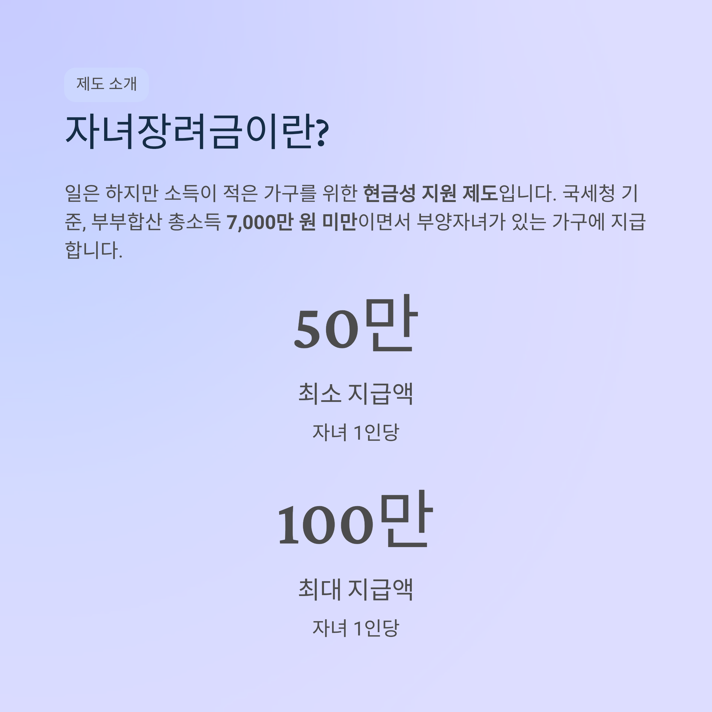 자녀장려금은 자녀를 키우는 저소득 가구의 부담을 줄이기 위해 지급하는 제도입니다. 국세청 기준으로 부부합산 총소득 7,000만 원 미만이면서 부양자녀(18세 미만)가 있는 홑벌이·맞벌이 가구라면 신청 대상이 될 수 있고, 자녀 1인당 최소 50만 원에서 최대 100만 원까지 받을 수 있습니다. 단, 단독가구는 자녀장려금 대상이 아닙니다.
