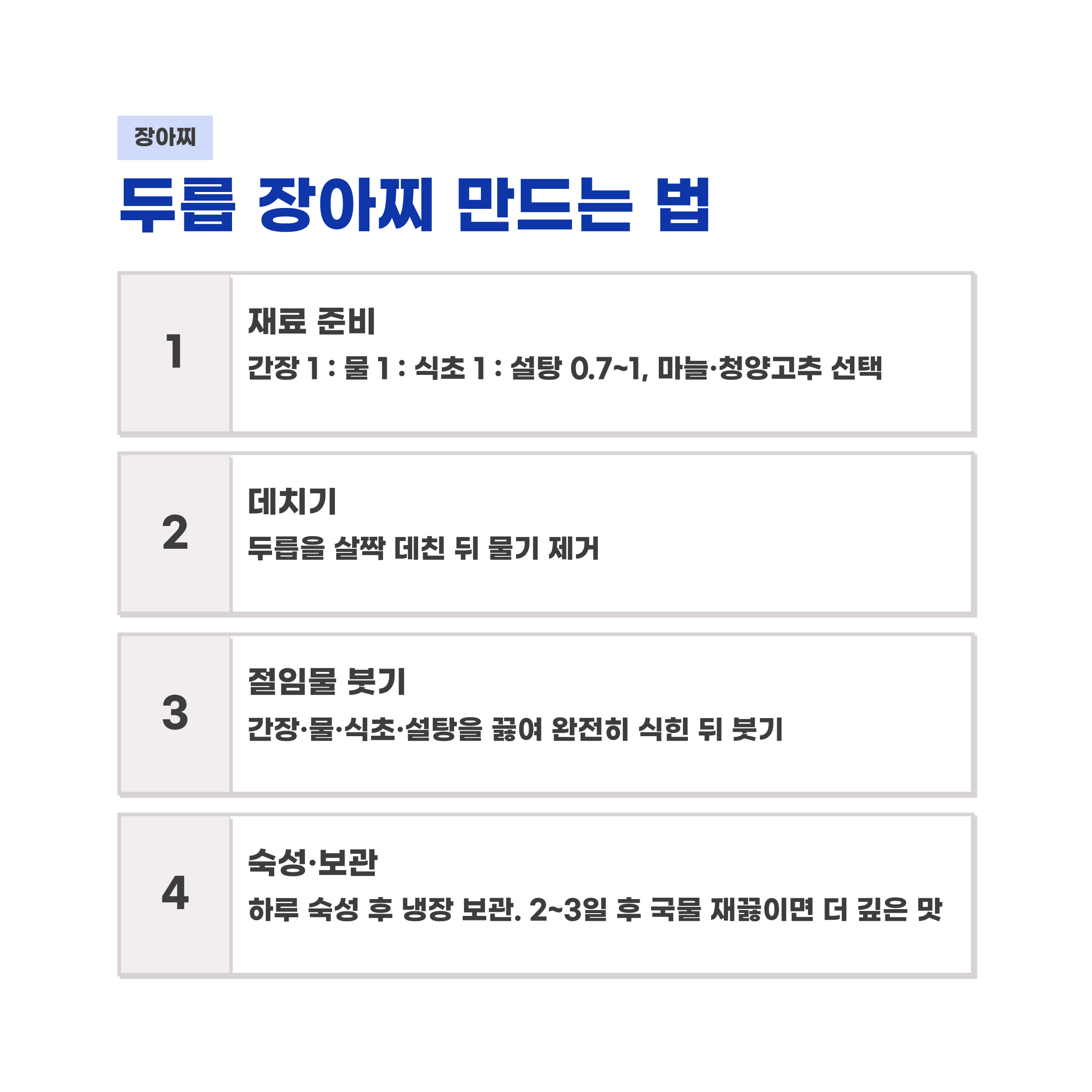 더 깊은 맛을 원하면 2~3일 후 국물을 한 번 따라내 다시 끓여서 식힌 뒤 다시 부으면 좋습니다.
