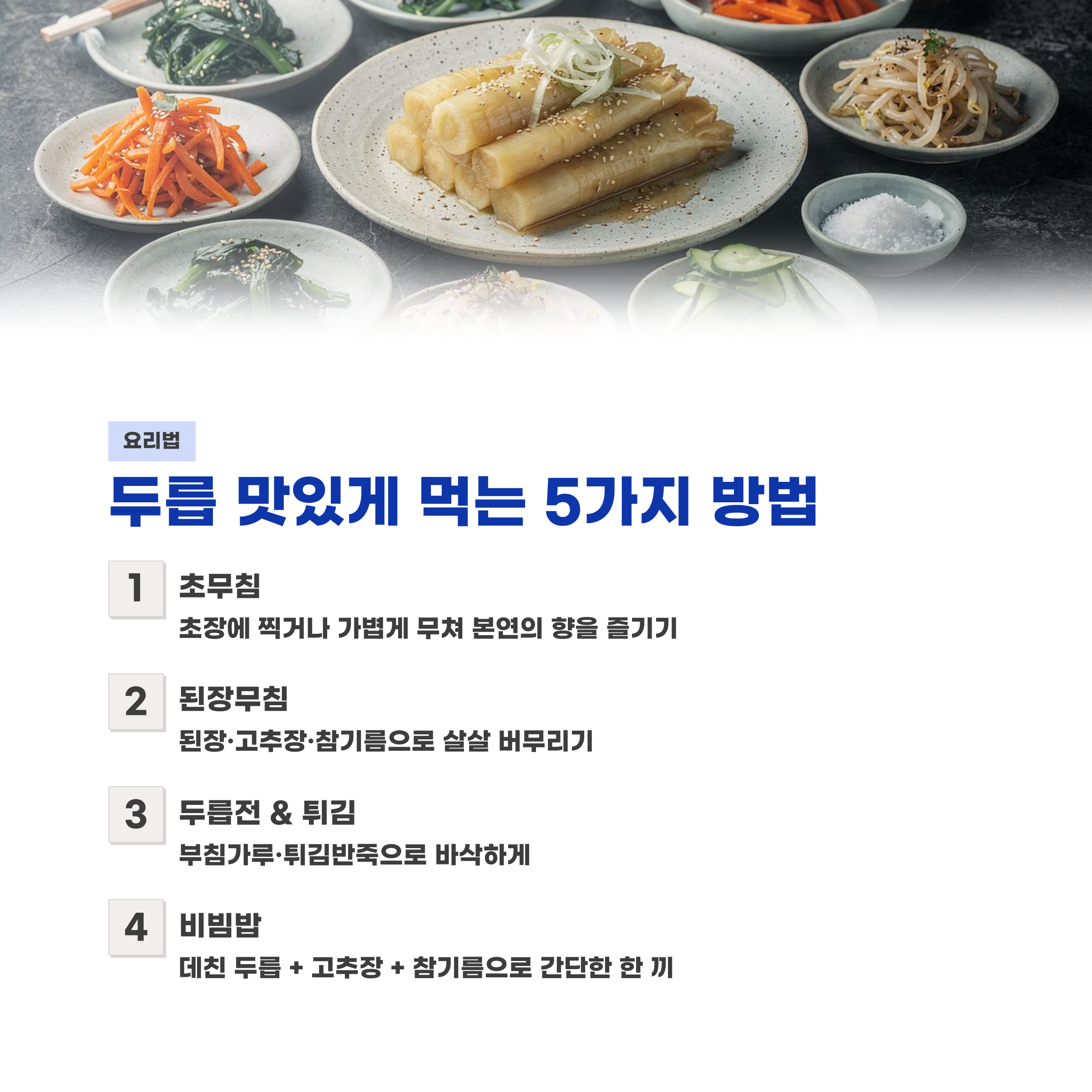 - 무침, 장아찌, 튀김 등 어떤 요리에도 잘 어울림