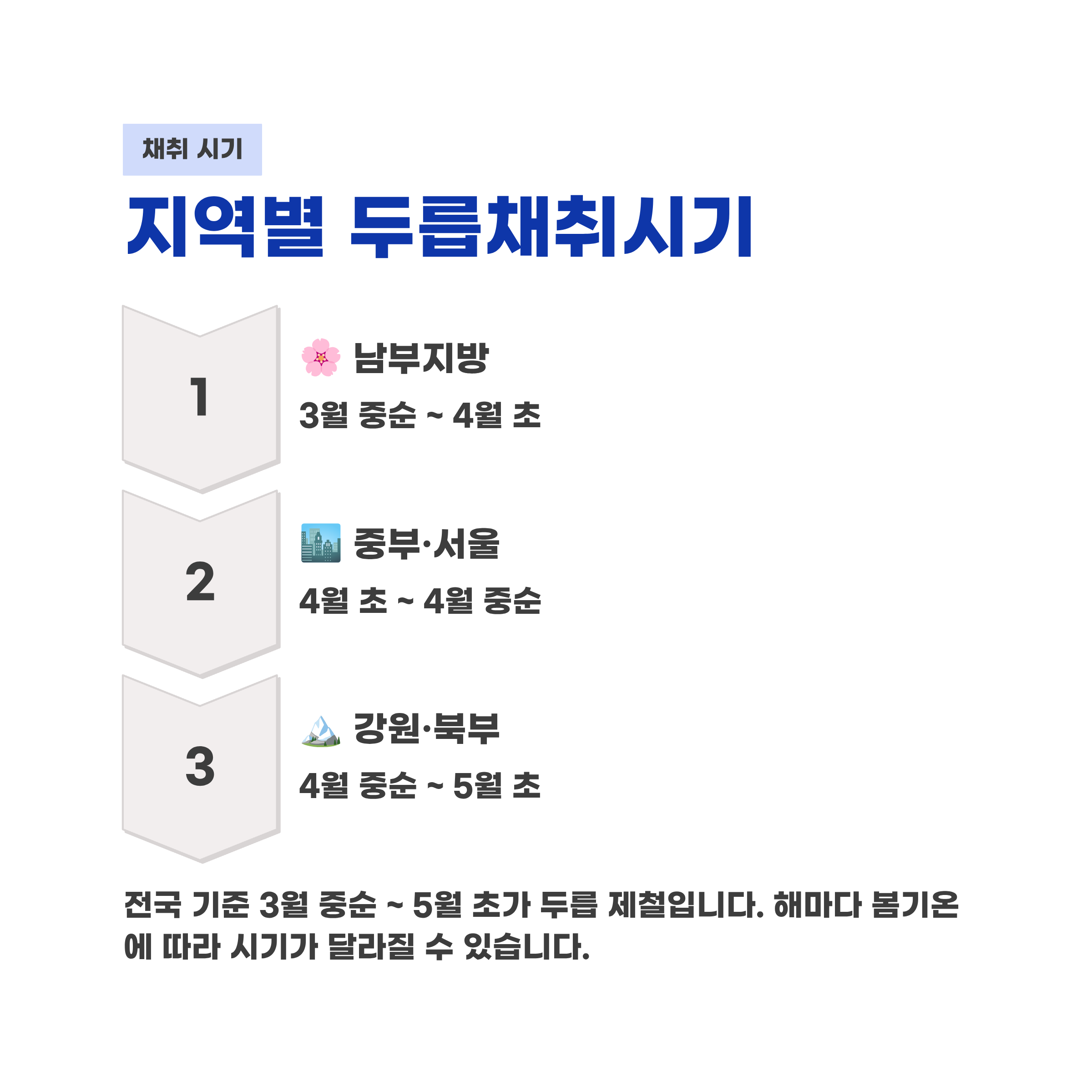 두릅은 기온과 지역에 따라 채취 시기가 조금씩 다릅니다. 같은 봄이라도 남부지방과 강원·북부 지역은 시차가 있기 때문에 지역별 시기를 따로 보는 것이 중요합니다.