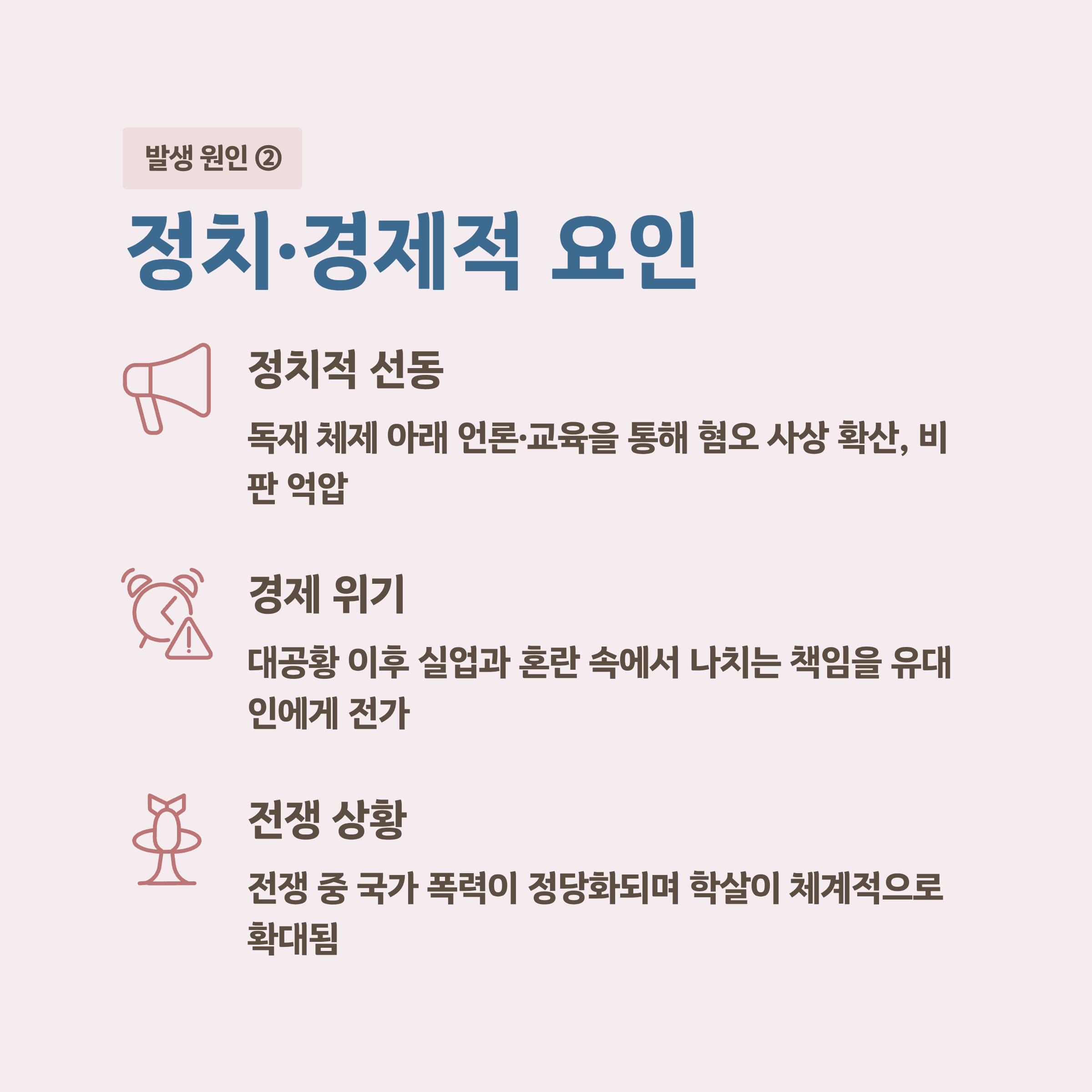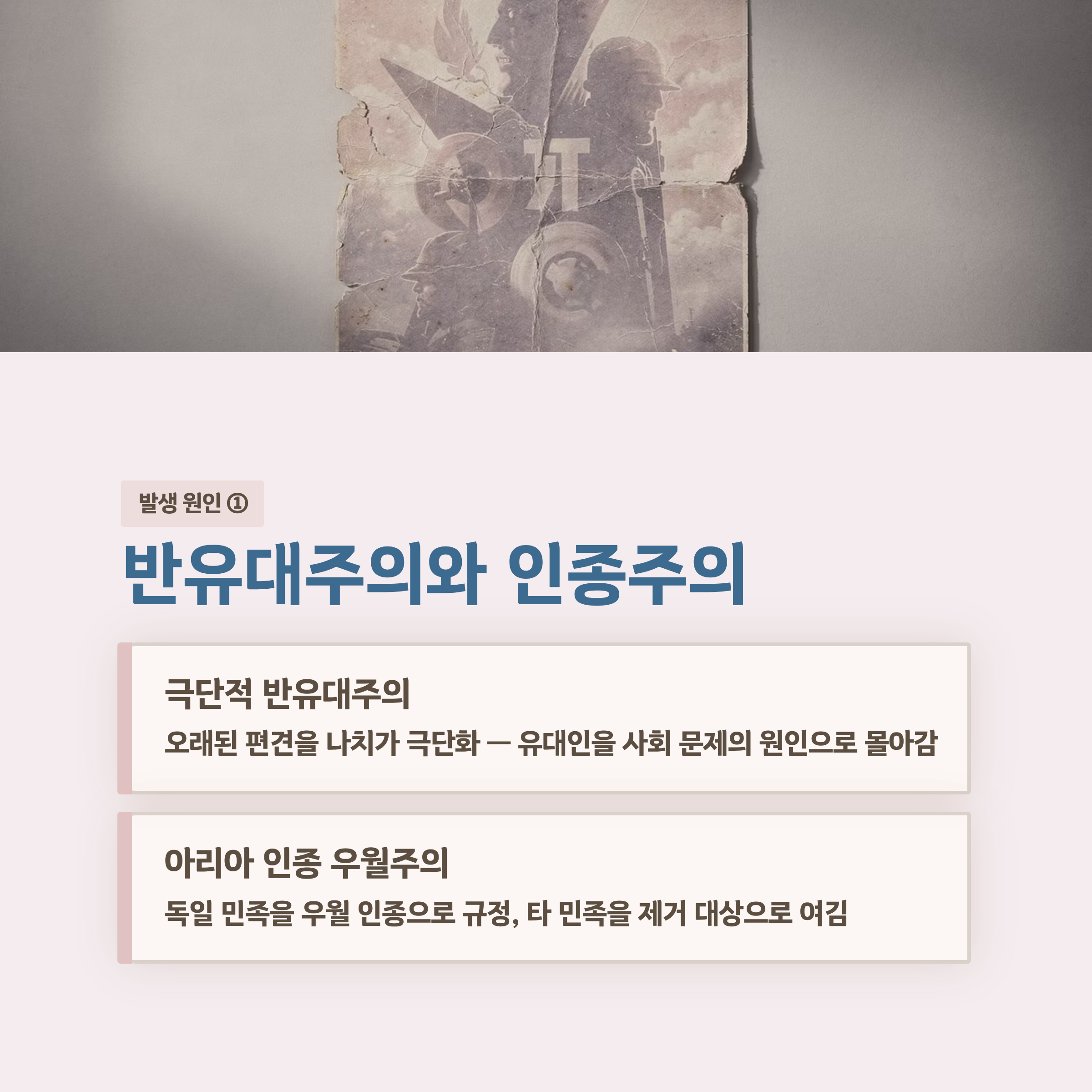 - 원인은 반유대주의, 인종주의, 경제 위기, 정치적 선동, 전쟁 상황이 복합적으로 작용
