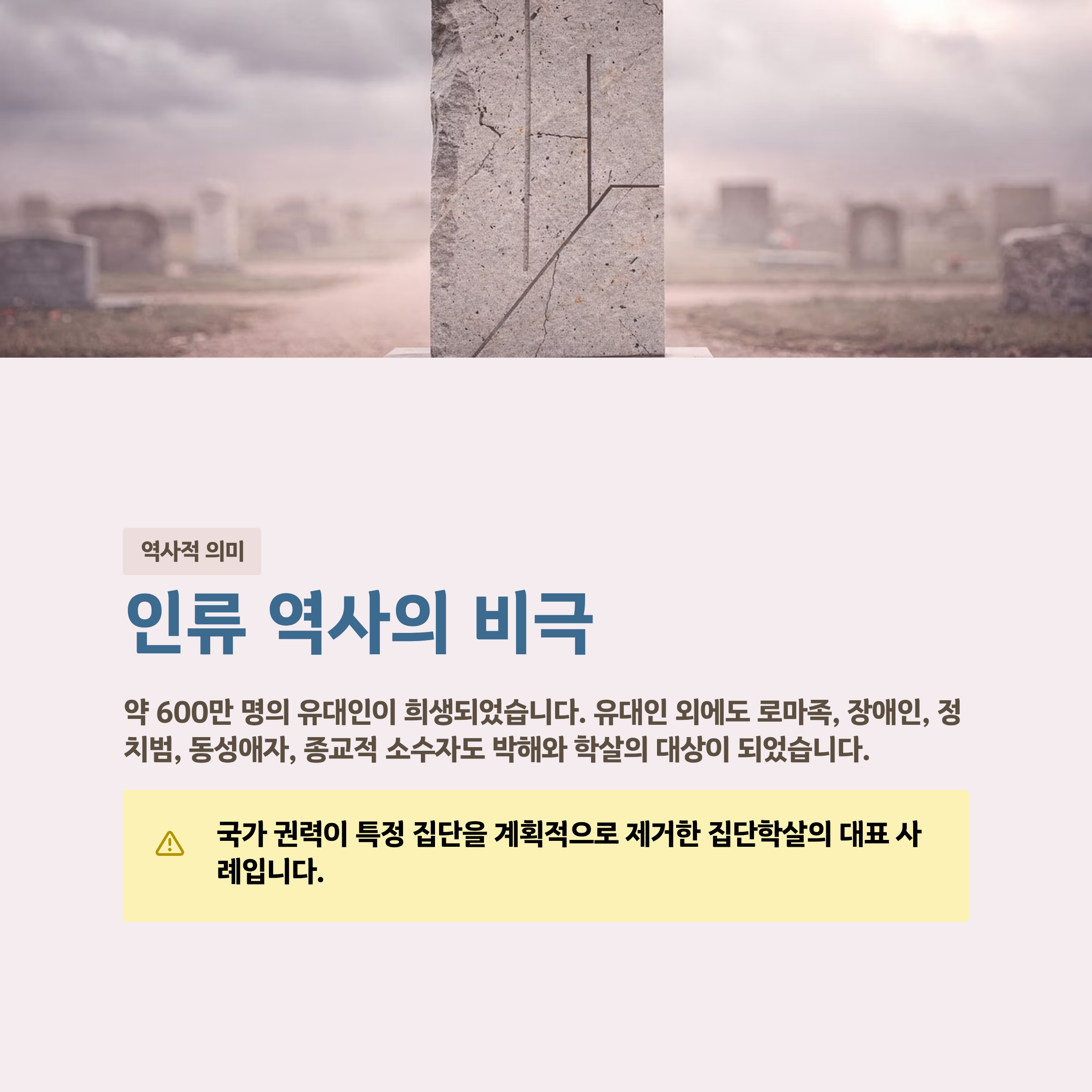 홀로코스트는 단순한 전쟁 중 희생이 아닙니다. 국가 권력이 특정 민족과 집단을 계획적으로 제거하려 한 집단학살의 대표 사례라는 점에서 큰 의미를 가집니다.