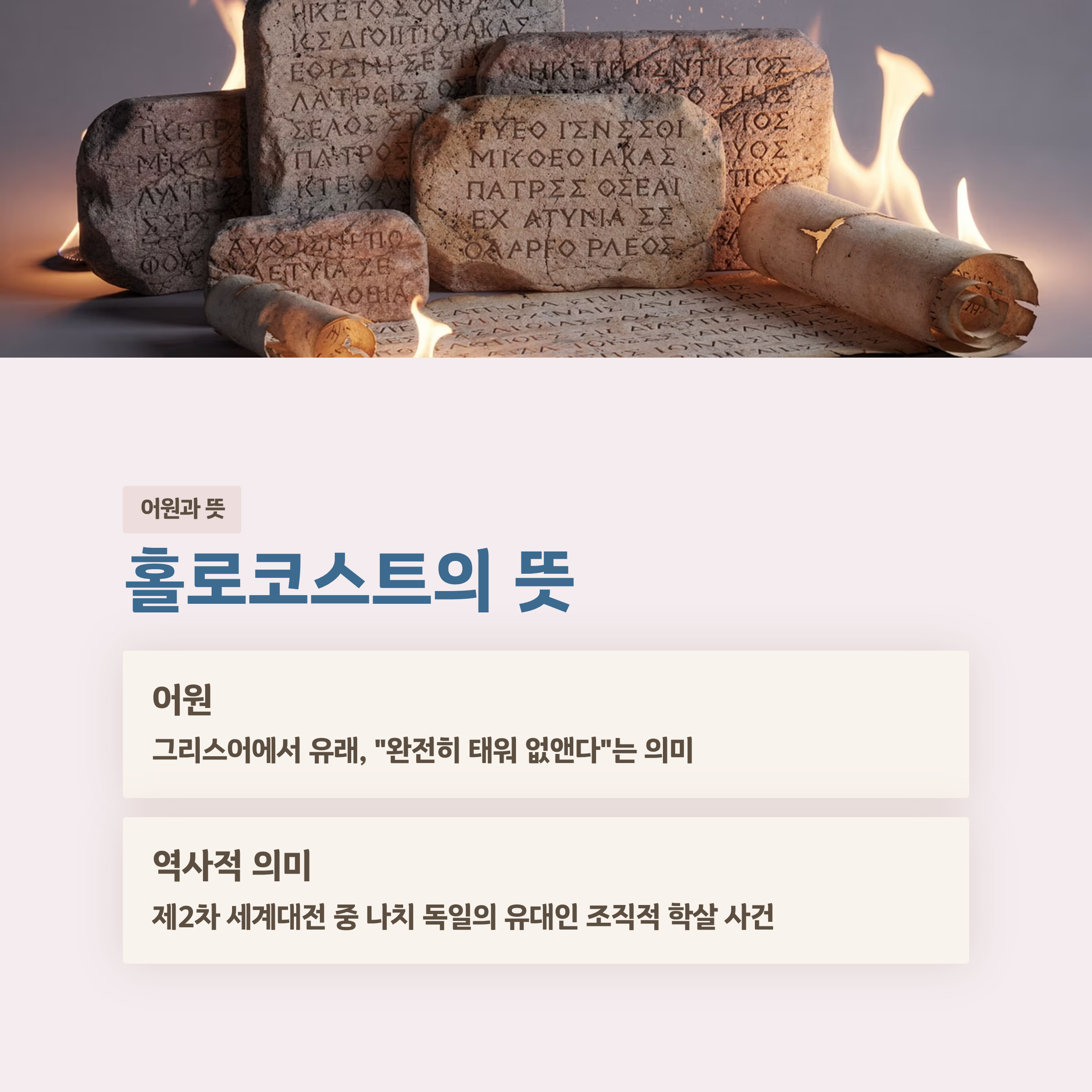 홀로코스트는 원래 “완전히 태워 없앤다”는 뜻의 그리스어에서 유래했으며, כיום에는 제2차 세계대전 중 나치 독일이 유대인을 조직적으로 학살한 사건을 뜻합니다.
