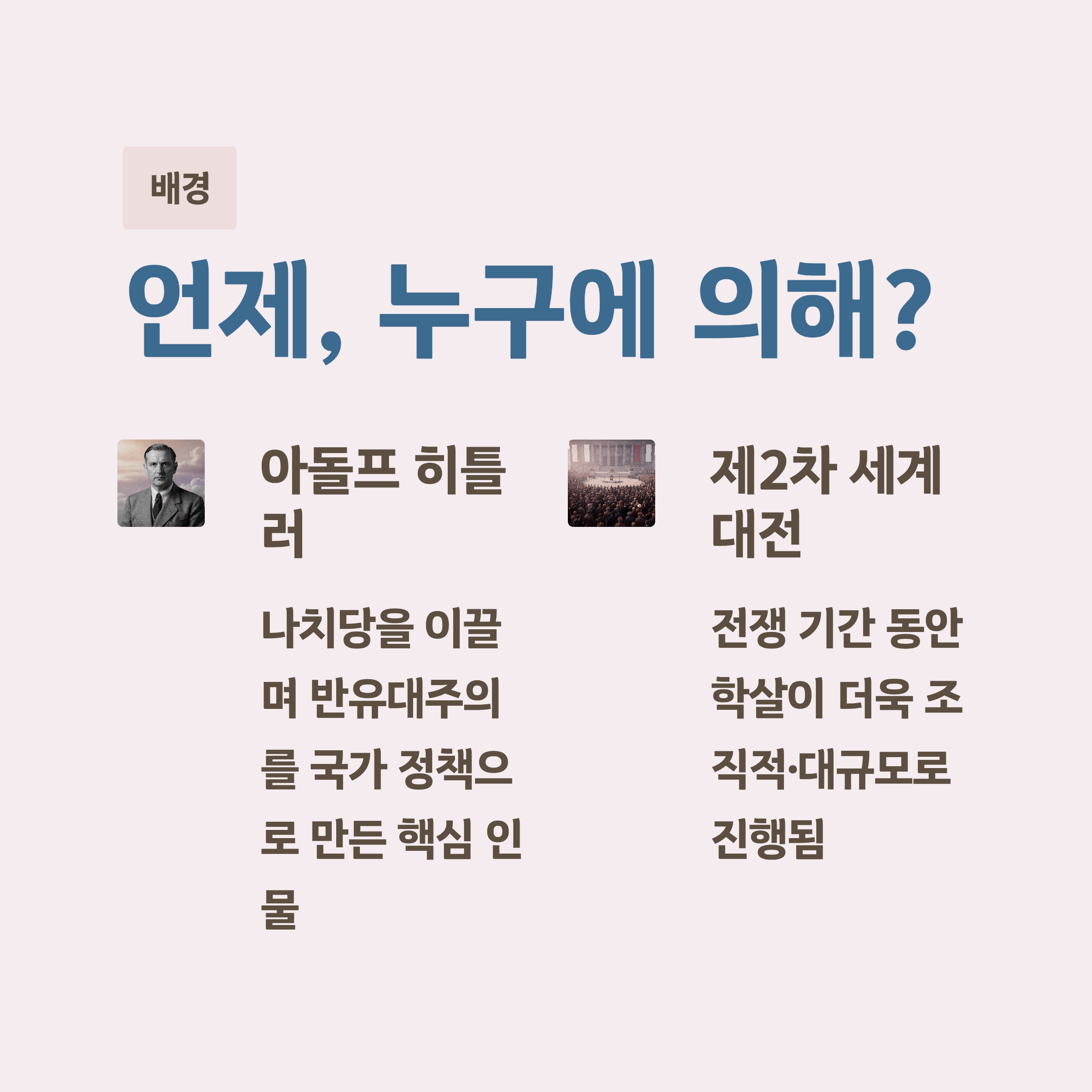 히틀러는 독일 사회의 불안과 불만을 이용해 권력을 강화했고, 이후 반유대주의와 인종주의를 국가 정책 수준으로 끌어올렸습니다. 그 결과 유대인을 비롯한 여러 집단이 제도적 차별과 대규모 학살의 대상이 되었습니다.