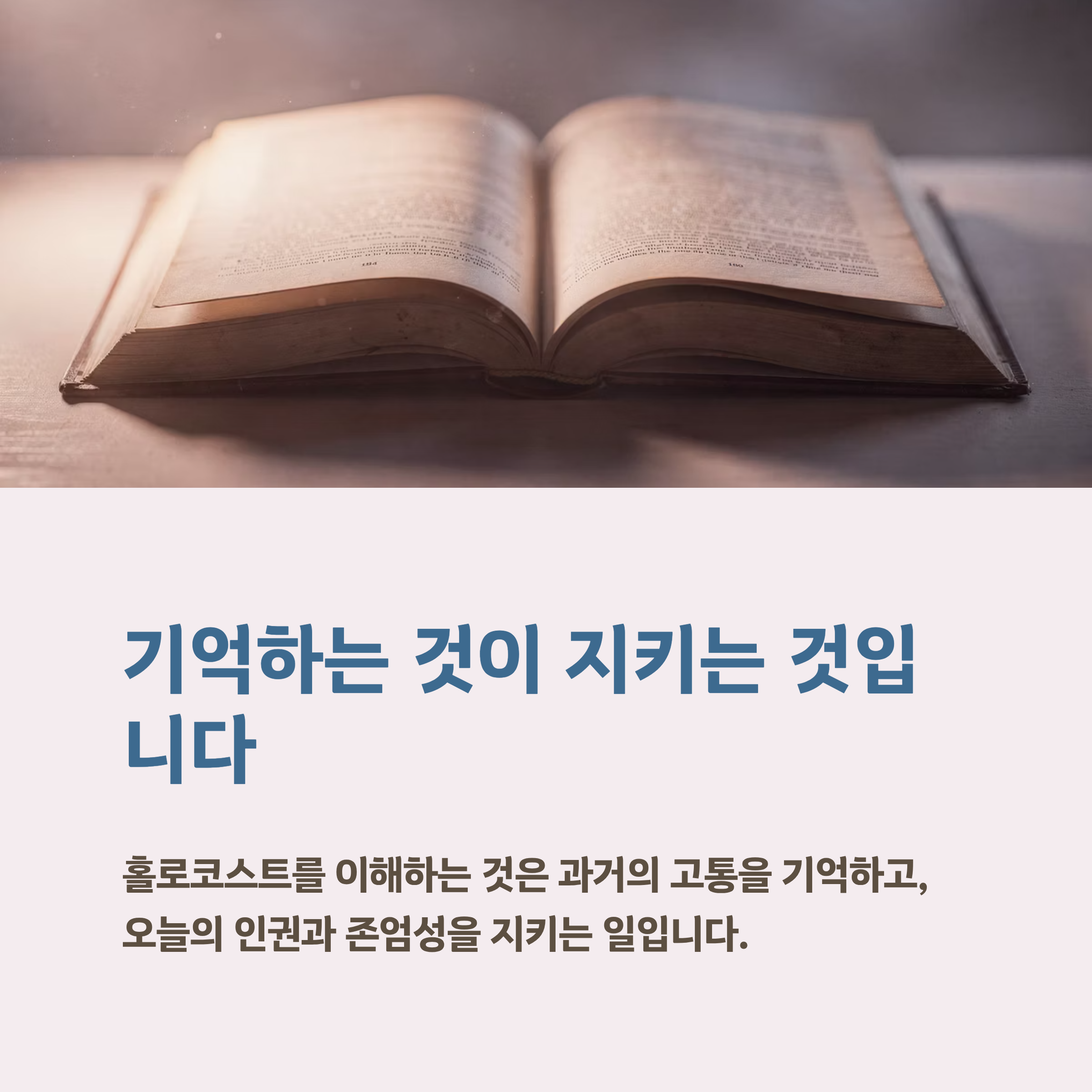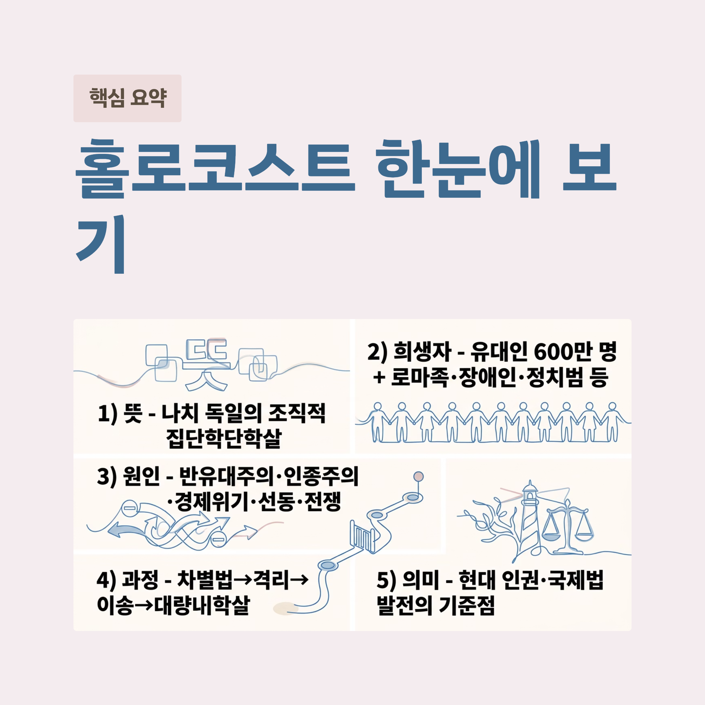 홀로코스트를 이해한다는 것은 과거의 고통을 기억하는 동시에, 오늘의 사회에서 인권과 존엄성을 지키는 일이 얼마나 중요한지 되새기는 일과도 같습니다. 역사 공부를 할 때 홀로코스트를 반드시 짚는 이유도 바로 여기에 있습니다.