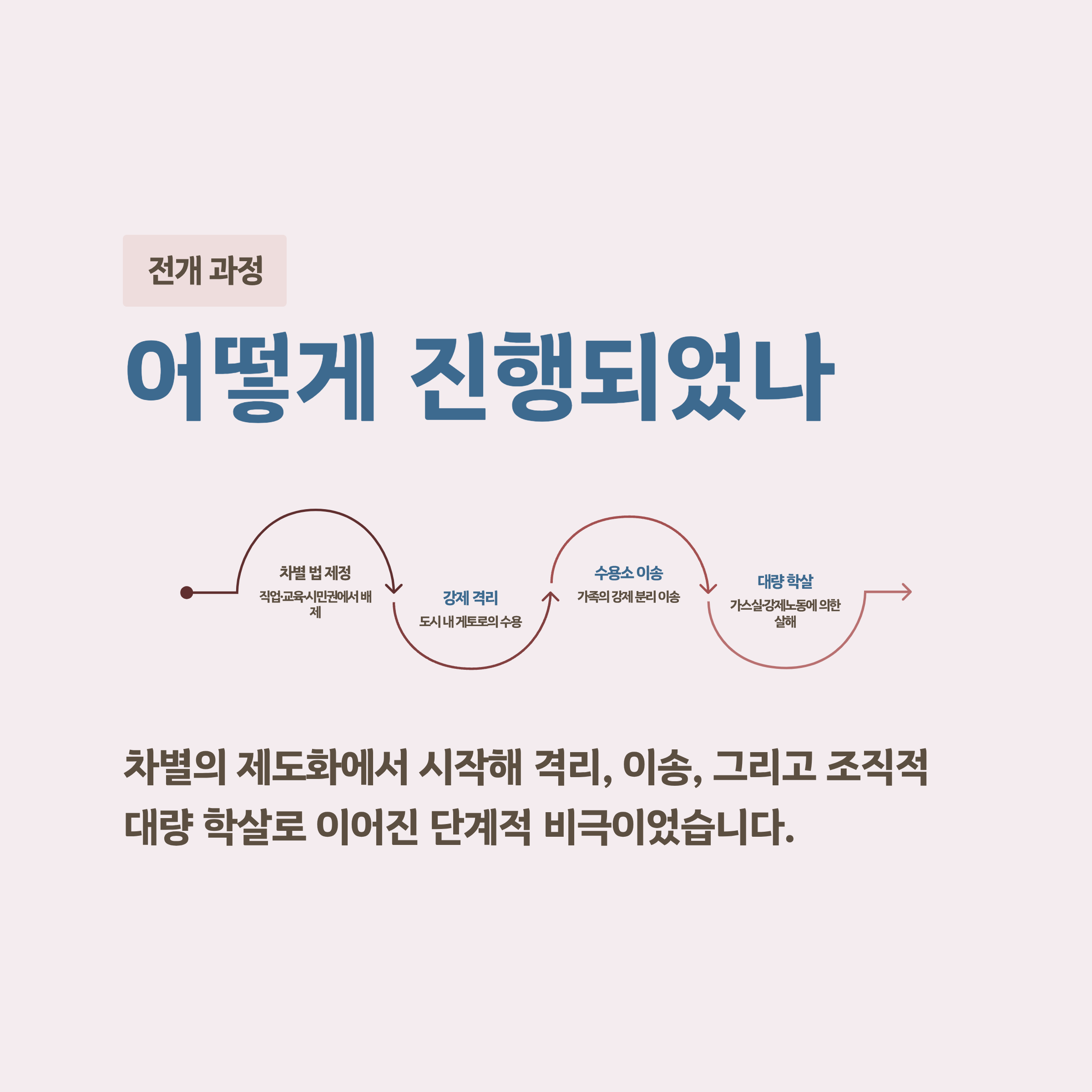 홀로코스트는 갑자기 하루아침에 일어난 사건이 아닙니다. 차별이 제도화되고, 격리와 강제이주를 거쳐, 결국 대량학살로 이어지는 과정을 밟았습니다.