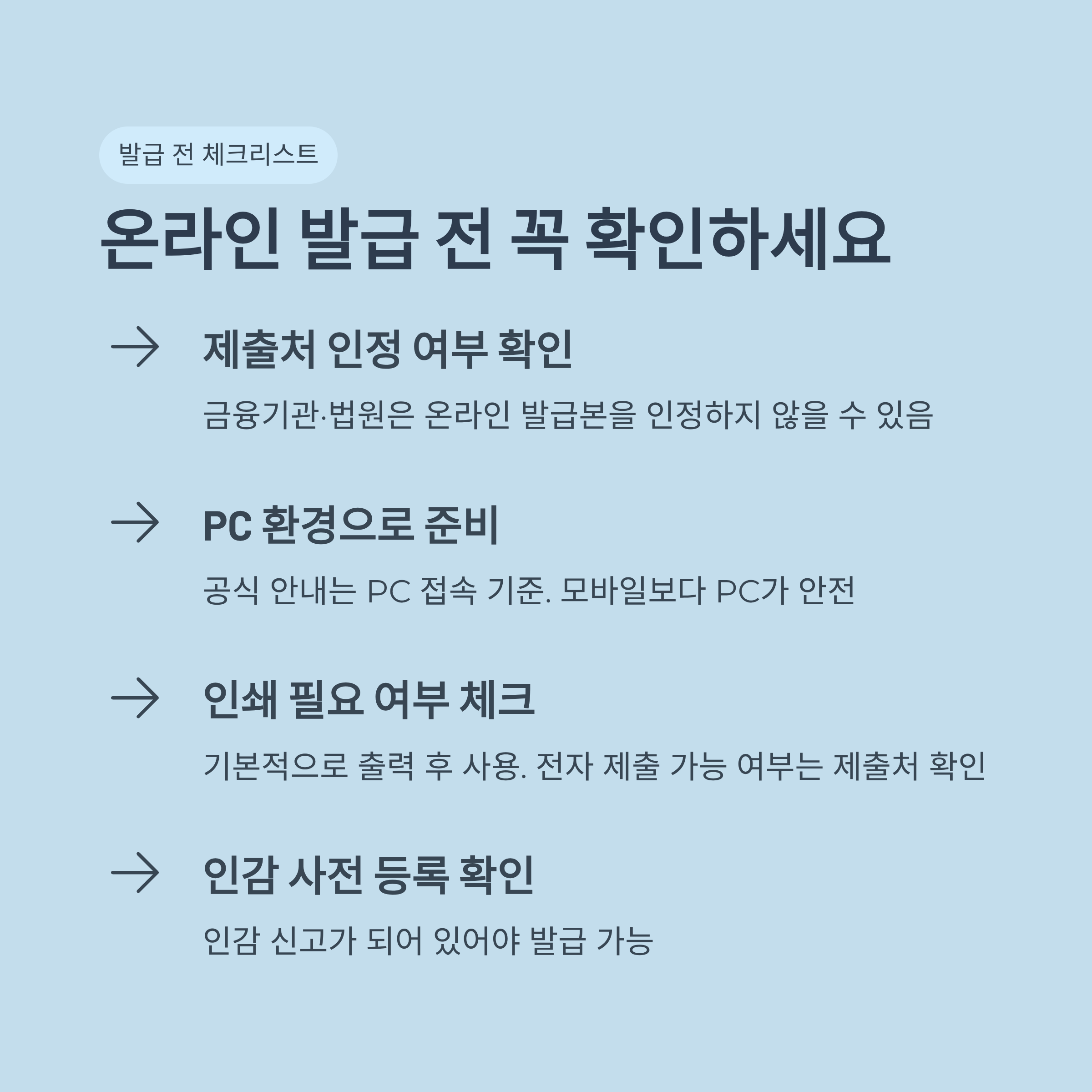 공식 안내는 PC 접속 후 발급 절차를 기준으로 설명하고 있습니다. 실제 신청은 PC 환경으로 준비하는 것이 가장 안전합니다.