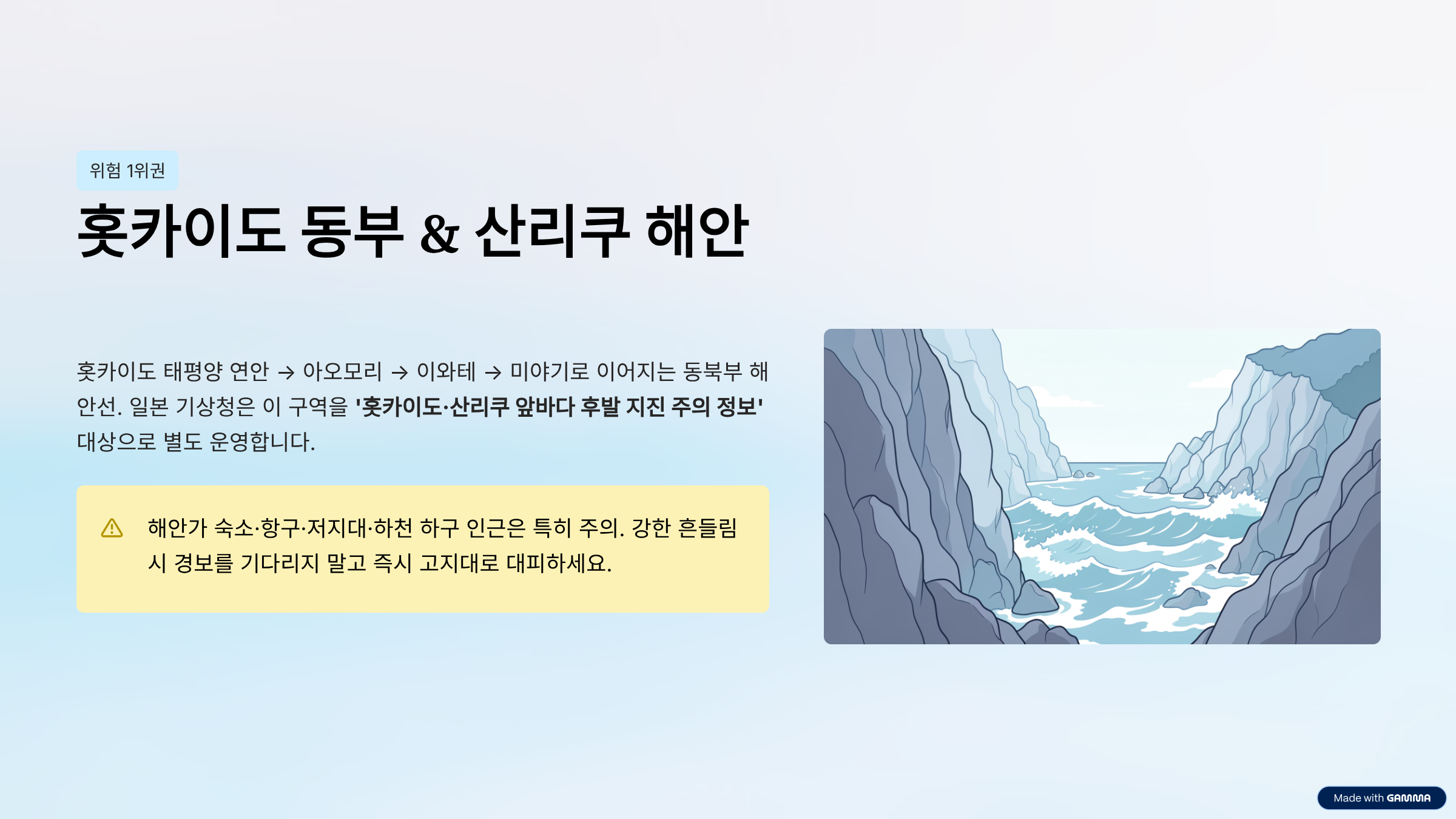 검색자 입장에서 가장 먼저 기억할 지역은 홋카이도 태평양 연안, 아오모리, 이와테, 미야기로 이어지는 동북부 해안선입니다. 일본 기상청은 ‘홋카이도·산리쿠 앞바다 후발 지진 주의 정보’ 대상 구역을 따로 운영하고 있고, 이 지역은 큰 지진 뒤 다시 대형지진이나 쓰나미를 경계해야 하는 대표 구간입니다.