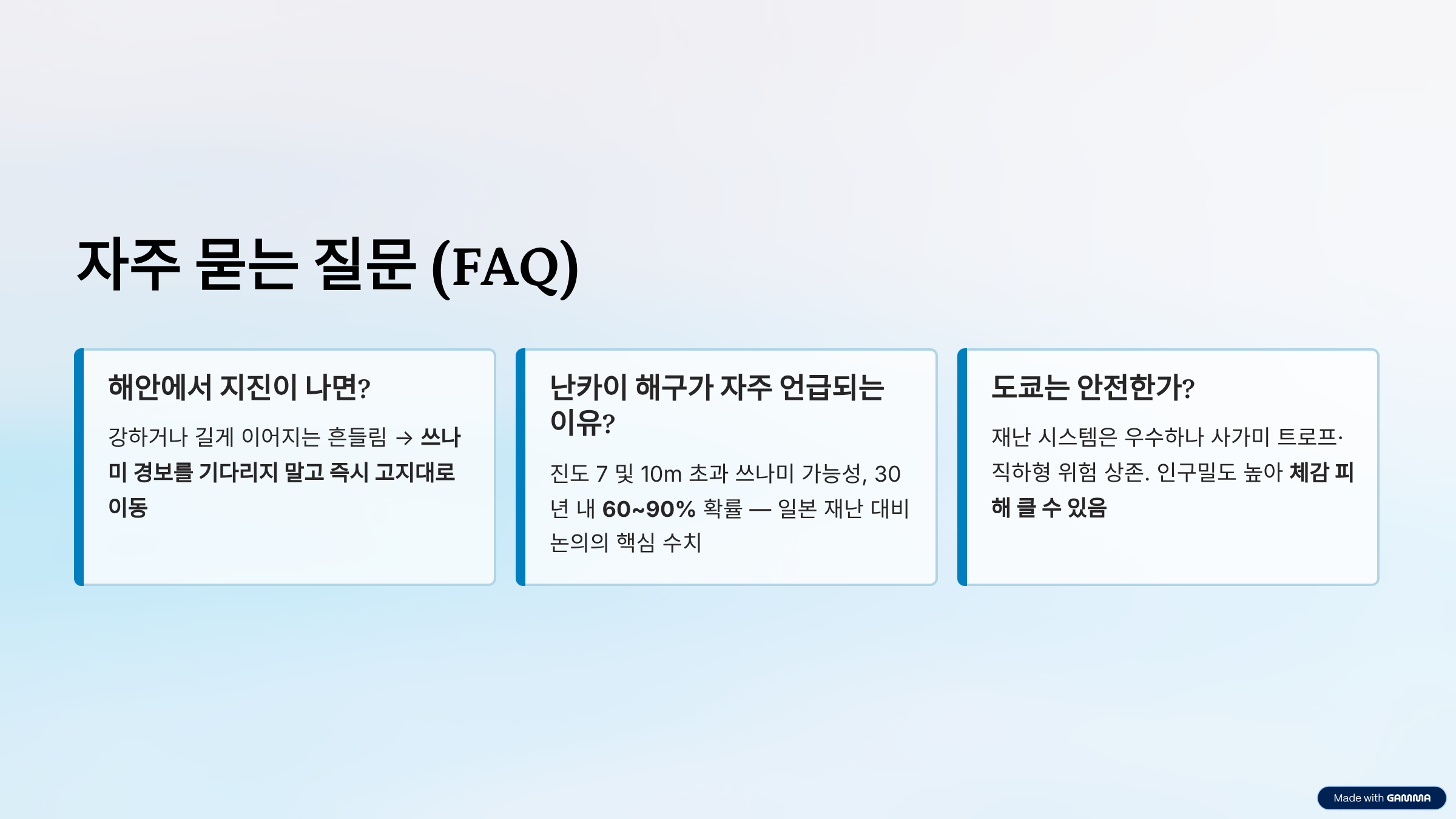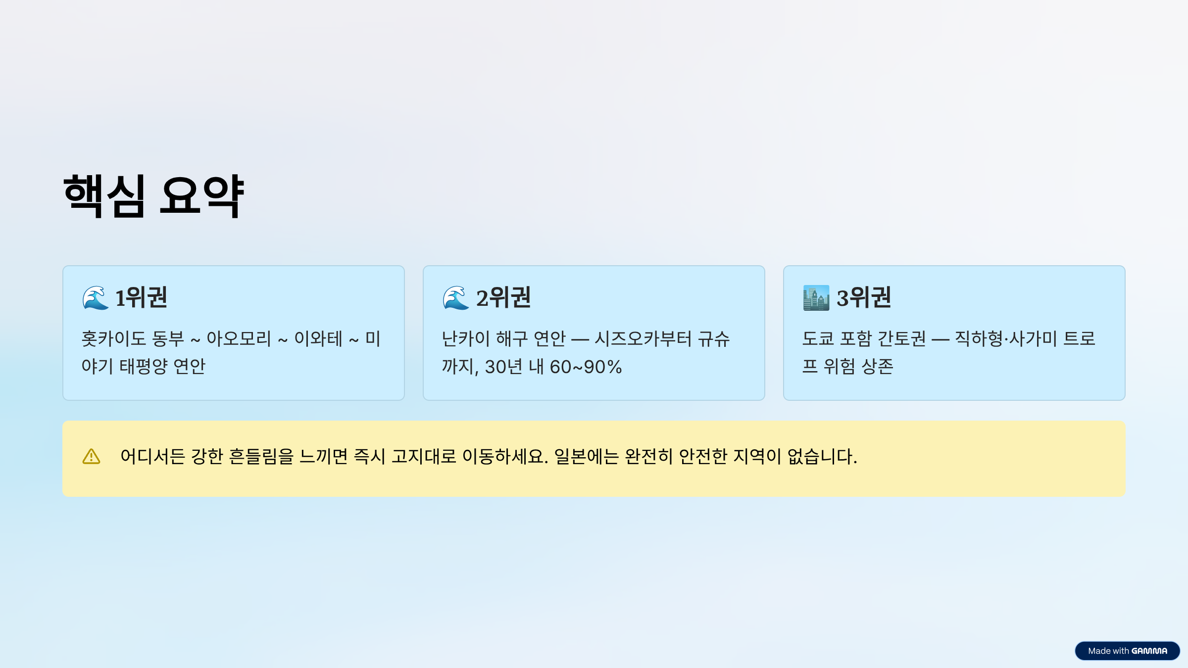 정리하면, 일본 지진 위험 지역으로 가장 먼저 기억해야 할 곳은 다음 세 축입니다.
