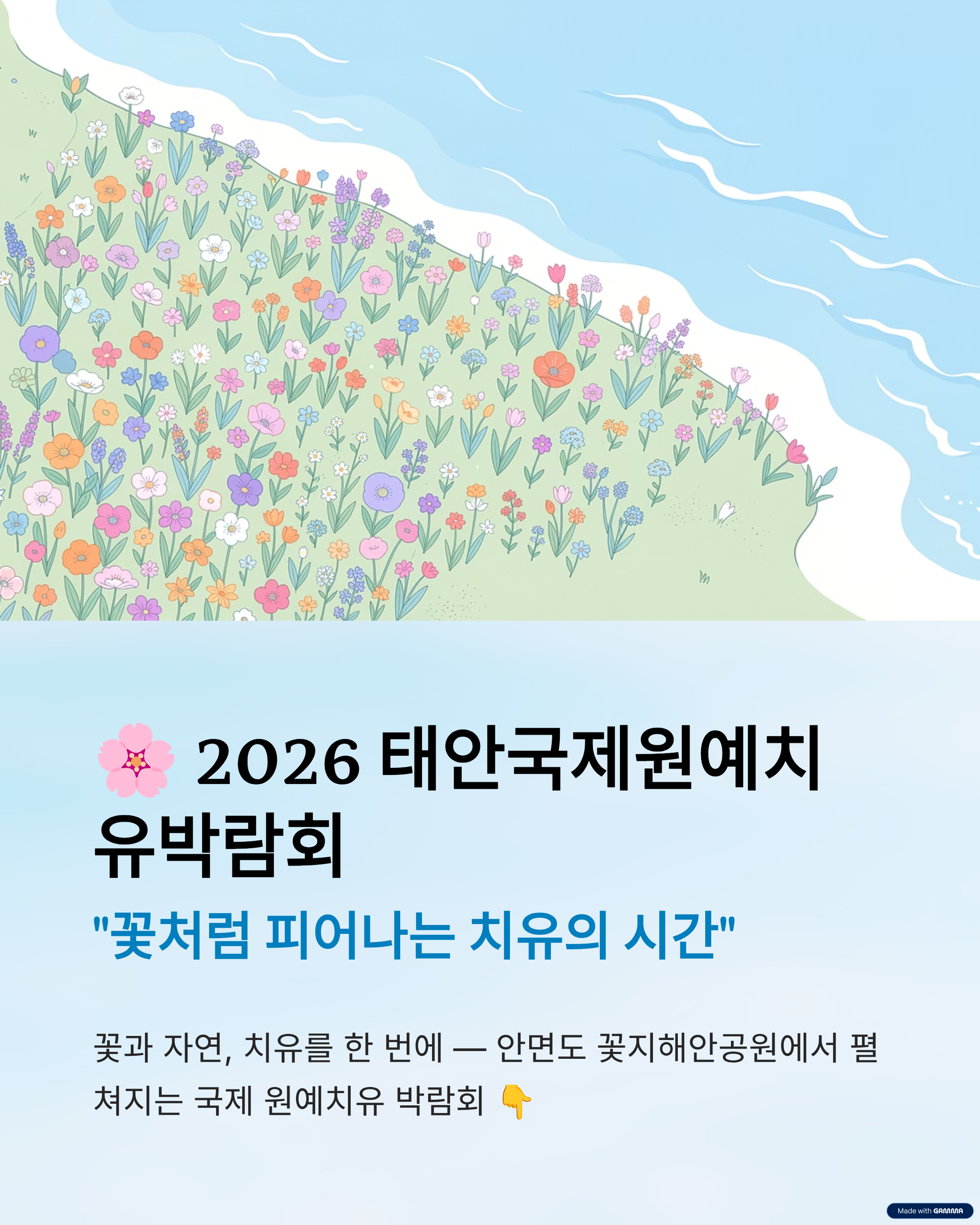 꽃과 자연, 그리고 치유를 한 번에 즐길 수 있는 2026 태안국제원예치유박람회가 봄 시즌 태안에서 열립니다. 이번 박람회는 단순한 꽃 전시를 넘어 원예·치유·체험·관광을 함께 묶은 국제 행사로 기획됐습니다. 공식 홈페이지에 따르면 행사는 2026년 4월 25일부터 5월 24일까지 30일간 진행되며, 장소는 충청남도 태안군 안면도 꽃지해안공원입니다. 운영 시간은 오전 9시부터 오후 6시까지입니다.