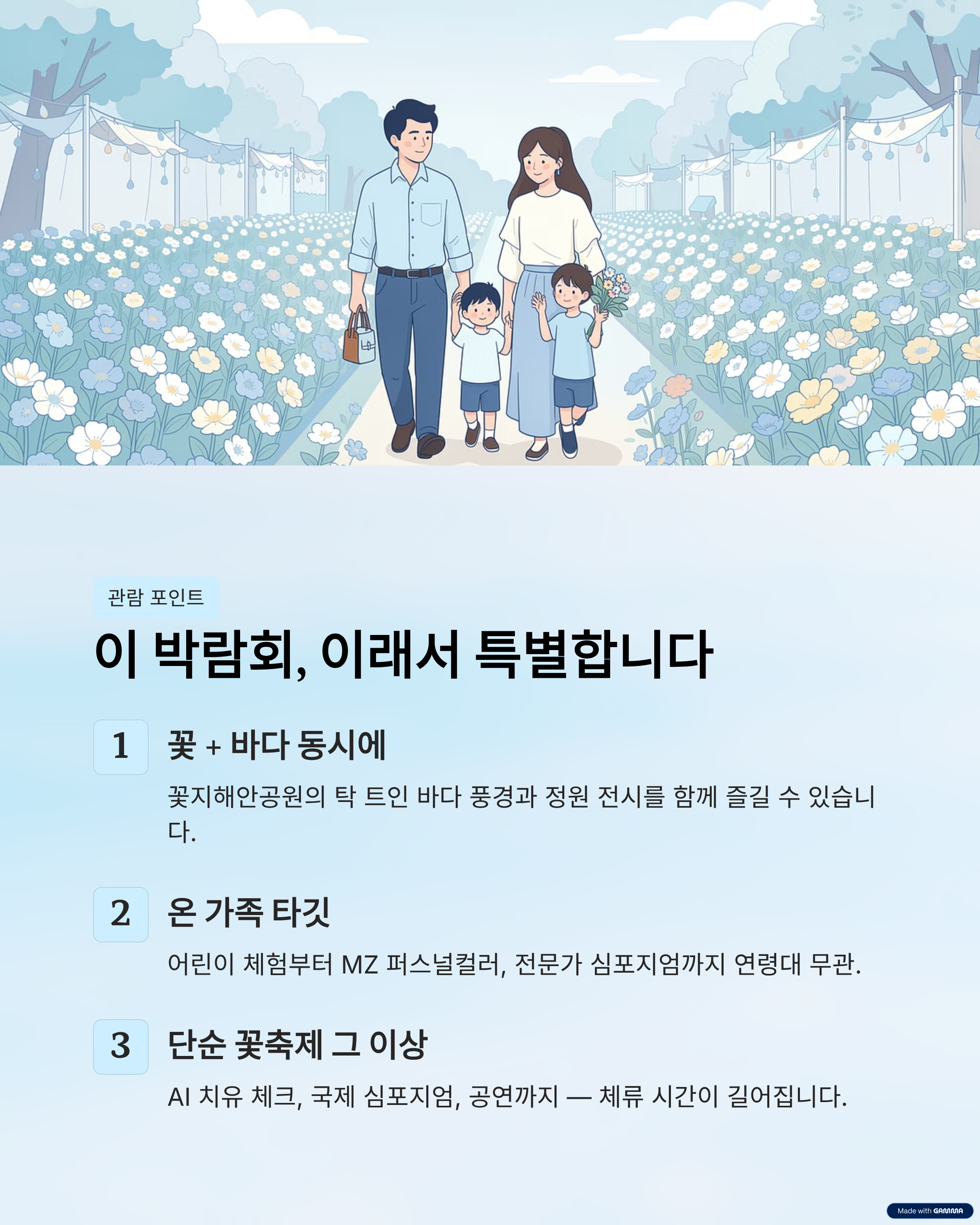 그래서 일반 관람객 입장에서는 꽃과 정원을 보는 재미가 중심이지만, 업계 관계자나 관련 전공자에게는 산업·정책·치유 트렌드까지 함께 확인할 수 있는 행사라는 점도 의미가 있습니다. 이 부분은 다른 봄꽃 축제와 구분되는 차별점입니다.