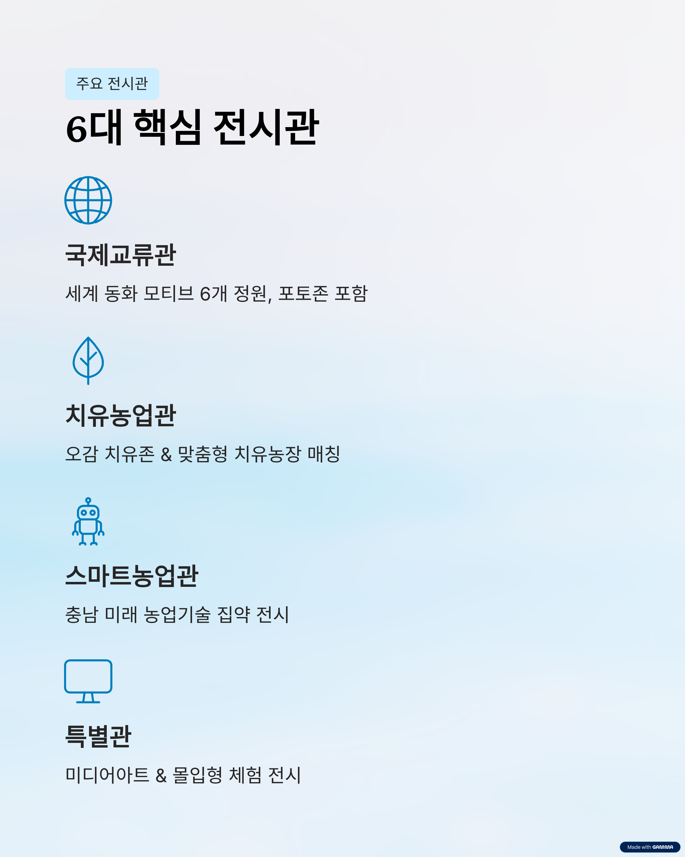 | 주요 전시 | 특별관, 치유농업관, 국제교류관, 산업관, 충남 스마트농업관, 15개 시·군관 |