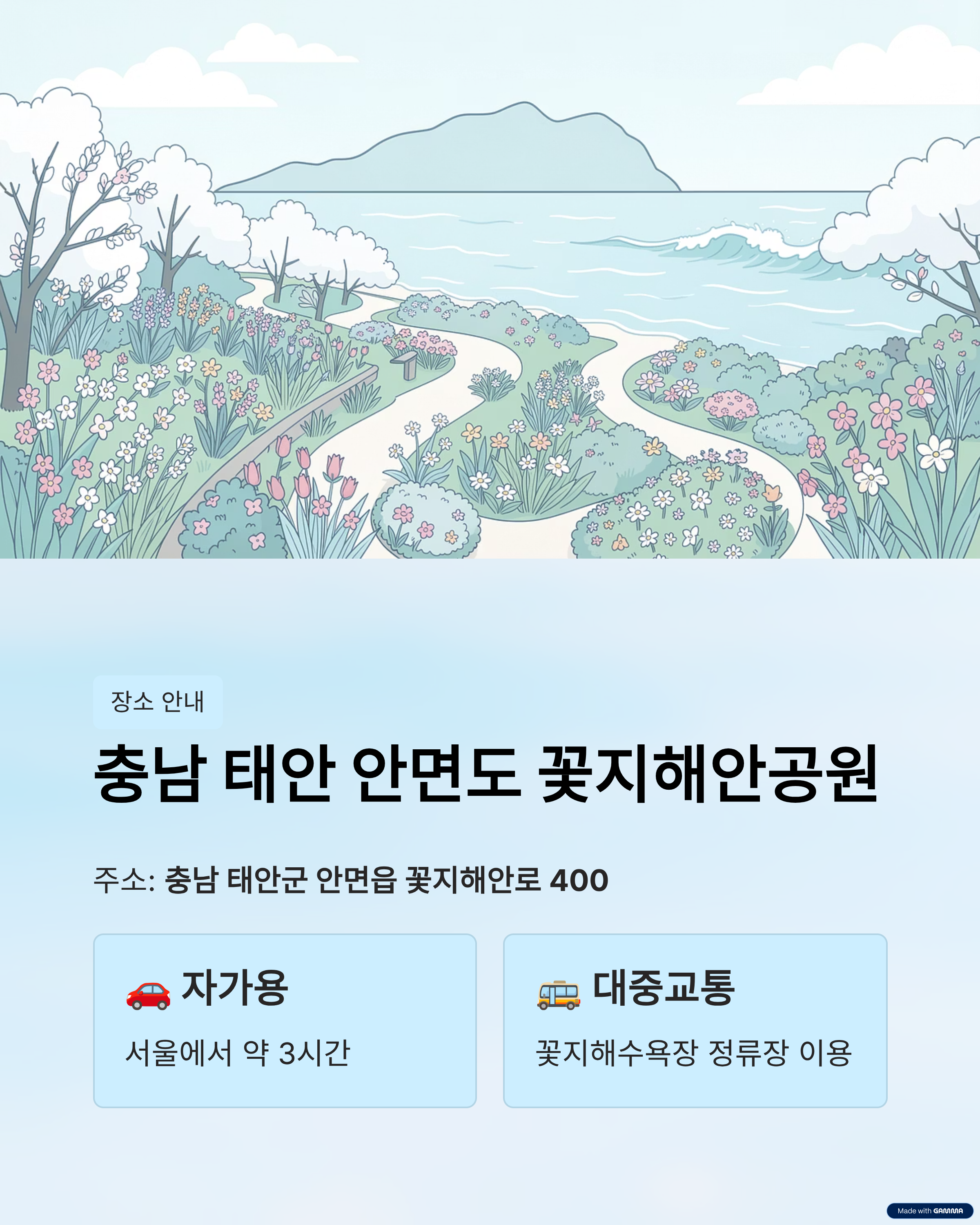 행사 장소는 충청남도 태안군 안면읍 꽃지해안로 400, 안면도 꽃지해안공원입니다. 공식 안내 페이지에서는 꽃지해안공원 및 안면도수목원 일대로 소개하고 있어, 단일 전시장만 보는 행사라기보다 주변 자연환경까지 연결된 동선으로 이해하면 좋습니다. 대중교통은 꽃지해수욕장 정류장과 승언4리·동답 정류장을 이용할 수 있고, 자가용 이용 시 서울 기준 약 3시간 정도가 안내돼 있습니다.