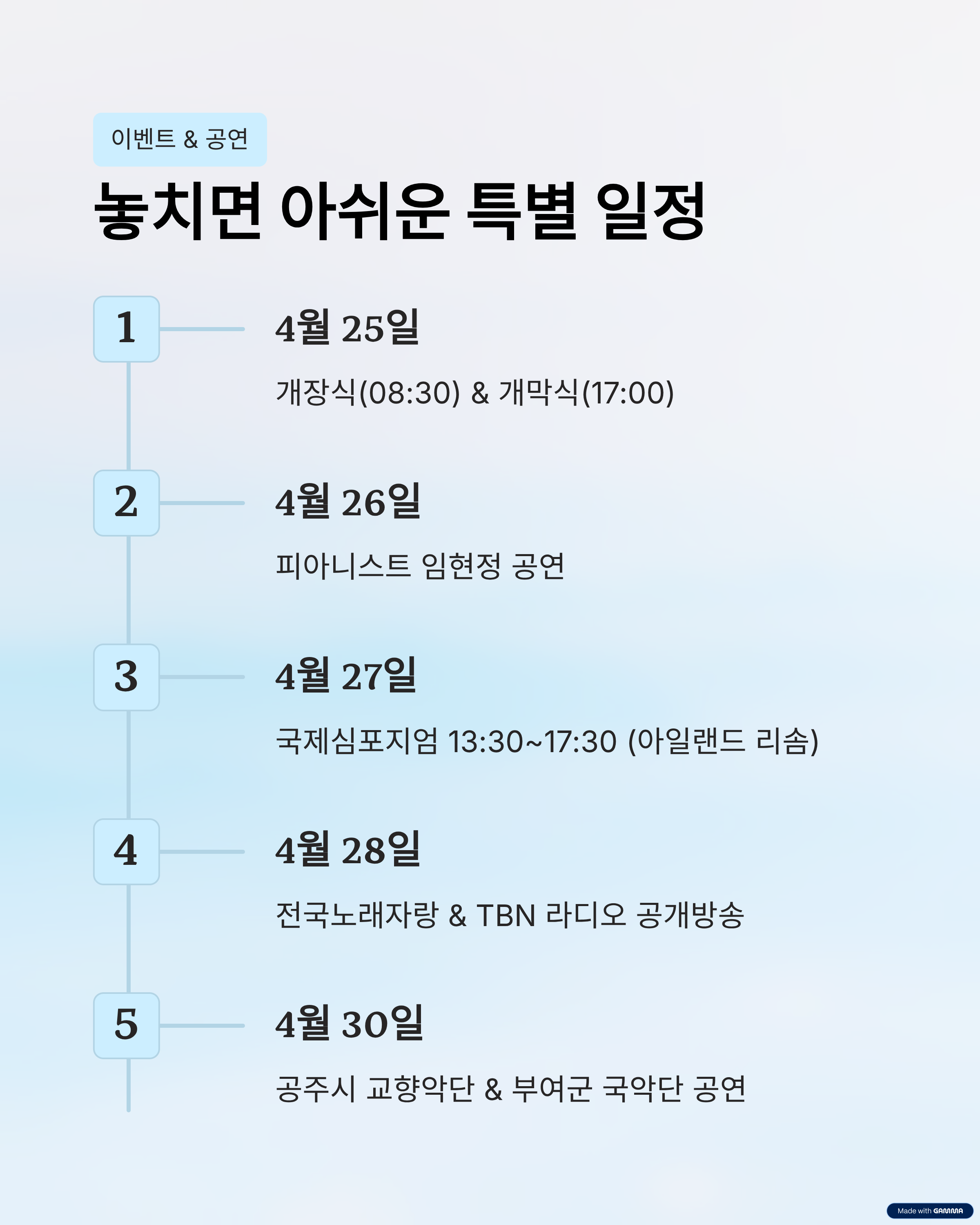 특히 박람회 일정표를 보면 4월 28일 전국노래자랑, 4월 29일 TBN 라디오 공개방송, 4월 30일 공주시 교향악단과 부여군 국악단 공연 등이 잡혀 있어 전시만 보는 행사보다는 현장 공연 비중도 꽤 있습니다. 개막일인 4월 25일에는 개장식과 개막식, 26일에는 피아니스트 임현정 공연도 예정돼 있습니다.